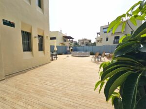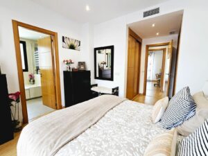 Inside, the apartment features three spacious bedrooms and two bathrooms. The master bedroom boasts an en-suite bathroom with a Jacuzzi bathtub and separate shower, while the other two bedrooms share a generous family bathroom. All bedrooms offer direct access to the lush garden and terrace, ensuring a bright and airy feel throughout.