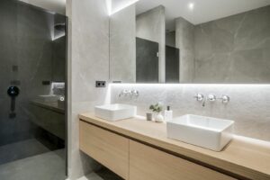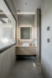The three bedrooms are refined and sophisticated, featuring wooden accents, bespoke wardrobes, and flattering LED lighting throughout. The elegantly decorated bathrooms are crowned with luxury showers and faucets from Dornbracht, where the grand master bathroom is completed with a bathtub and double vanity.