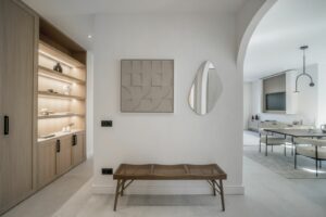 Entering the living area, you are greeted by a bespoke kitchen that exudes both elegance and functionality. It features stunning deep wooden accents on the island and cupboards, complemented by a soothing ‘Taj Mahal’ marble countertop. With ample storage, generous counter space, and a wine cooler, it is a modern kitchen that is incredibly functional for those who enjoy cooking and gatherings. The living room area is warm and inviting, featuring a majestic TV-wall with a spacious bench that offers ample storage.