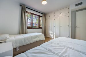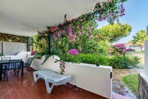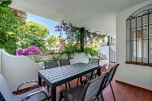 This magnificent ground floor apartment is located in Vivero de Marbella, a quiet, low-rise residential complex in the prestigious Sierra Blanca area on Marbella’s Golden Mile, between Imara and Le Blanc. Recently renovated with high-quality materials, the apartment offers a modern open-concept layout. It features a fully equipped kitchen with a breakfast bar and a bright living-dining area that opens onto a cozy terrace with outdoor sitting and dining areas and direct access to the communal garden. The master bedroom includes an en-suite bathroom and access to a private balcony, while the other two bedrooms share a bathroom. All bedrooms have built-in wardrobes, and there is also a practical separate laundry room. The complex is very well maintained and offers beautiful gardens with water features, a swimming pool, and communal parking. It’s an ideal place to enjoy peace and comfort in one of Marbella’s most exclusive areas. With a tourist license in place, the property presents an excellent investment opportunity.