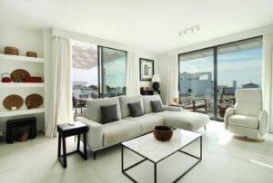 Set in a peaceful yet convenient location, just a nine-minute stroll from a choice of restaurants, bars and supermarkets, this exceptional three-bedroom south-facing penthouse enjoys sweeping Mediterranean views from almost every room and from its expansive terraces.