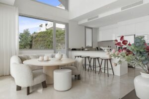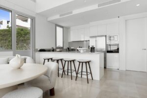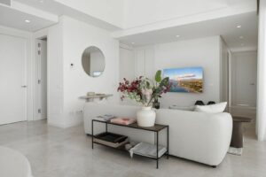 Upon entering this elegant penthouse, you are welcomed by an abundance of natural light, thanks to the large floor-to-ceiling windows and beautifully designed patio doors. These lead directly to your private terrace, where you can enjoy the serene surroundings and impressive views of the sea.