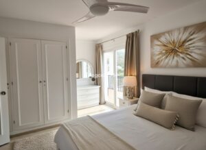 The master bedroom with en-suite bathroom enjoys direct access to the terrace, creating a private retreat with seamless indoor–outdoor living. Two additional bedrooms offer charming outlooks over the gardens, and mountain backdrop, with balconies and windows overlooking the community’s picturesque courtyards.