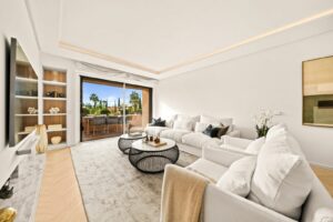 The living room features high-quality furniture, creating a refined yet inviting setting for relaxation. The modern open-plan kitchen comes fully equipped with top-of-the-line appliances.
