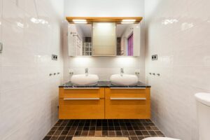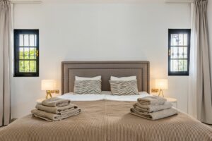 The layout is thoughtfully designed with three very spacious bedrooms, all with en-suite bathrooms. On the entrance level there are two bedrooms, one with direct access to a generous terrace. On the upper floor you find the master bedroom with direct access to a large sun terrace – an ideal space for relaxation or entertaining, with plenty of room for a dining area, sun loungers, an outdoor kitchen, and a shower.