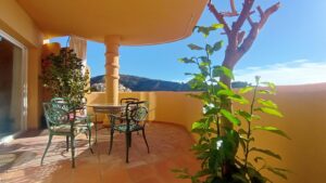 Stunning terraces with sea and mountain views. Over 60 square meters of covered and uncovered terraces. Immaculate two-story penthouse. Built-in interior staircase provides access to the upper level. The ground floor comprises two bedrooms and two full bathrooms, while the upper floor features a bedroom with a guest toilet. Terraces, views, and tranquility await. The complex boasts two pool and garden areas, as well as ample communal parking. The apartment is being sold almost fully furnished. Underground parking is available in the adjacent complex. The upstairs bedroom is more of a small living room, as it serves as a passageway to the large terrace. This is why we have listed three bedrooms.