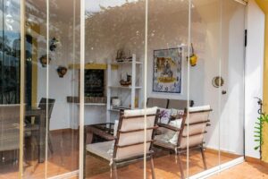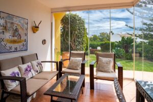 On the upper floor there is a hall that gives access to three large bedrooms and two bathrooms, one of them en suite. All the bedrooms have ceiling fans. In addition, two of them have private balconies with beautiful views to the green areas and the swimming pool.
