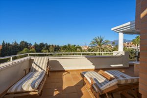 Exclusive corner penthouse in Dunas Green with a total of 175 m² of terraces. The main terrace faces southwest, enjoying morning sun thanks to the corner position and sun for most of the day, while the rooftop terrace gets sun all day. The property features 3 bedrooms, 2 bathrooms, and 1 guest toilet. Two covered parking spaces located next to each other. Well maintained and sold furnished. The community offers a beautiful pool, two padel courts, and spacious, well kept green areas, especially around the pool. Just a 15 minute walk to the sea.