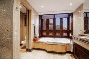 The interior of this duplex penthouse unfolds over 210m² of elegantly appointed space. The inclusion of a fully fitted kitchen and separate equipped kitchen ensures culinary enthusiasts are well catered to. Furthermore, the living and dining rooms create seamless integration for entertaining guests or enjoying intimate family dinners. Luxury is further accentuated by underfloor heating throughout the property and a sophisticated home automation system that tailors the environment to one’s desires.
