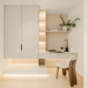 Inside the penthouse, you’ll find an expansive living room and a luxurious master bedroom, both opening onto spectacular, views of the Mediterranean Sea. An elegant electric fireplace adds a touch of modern sophistication, while large windows flood the interiors with natural light.