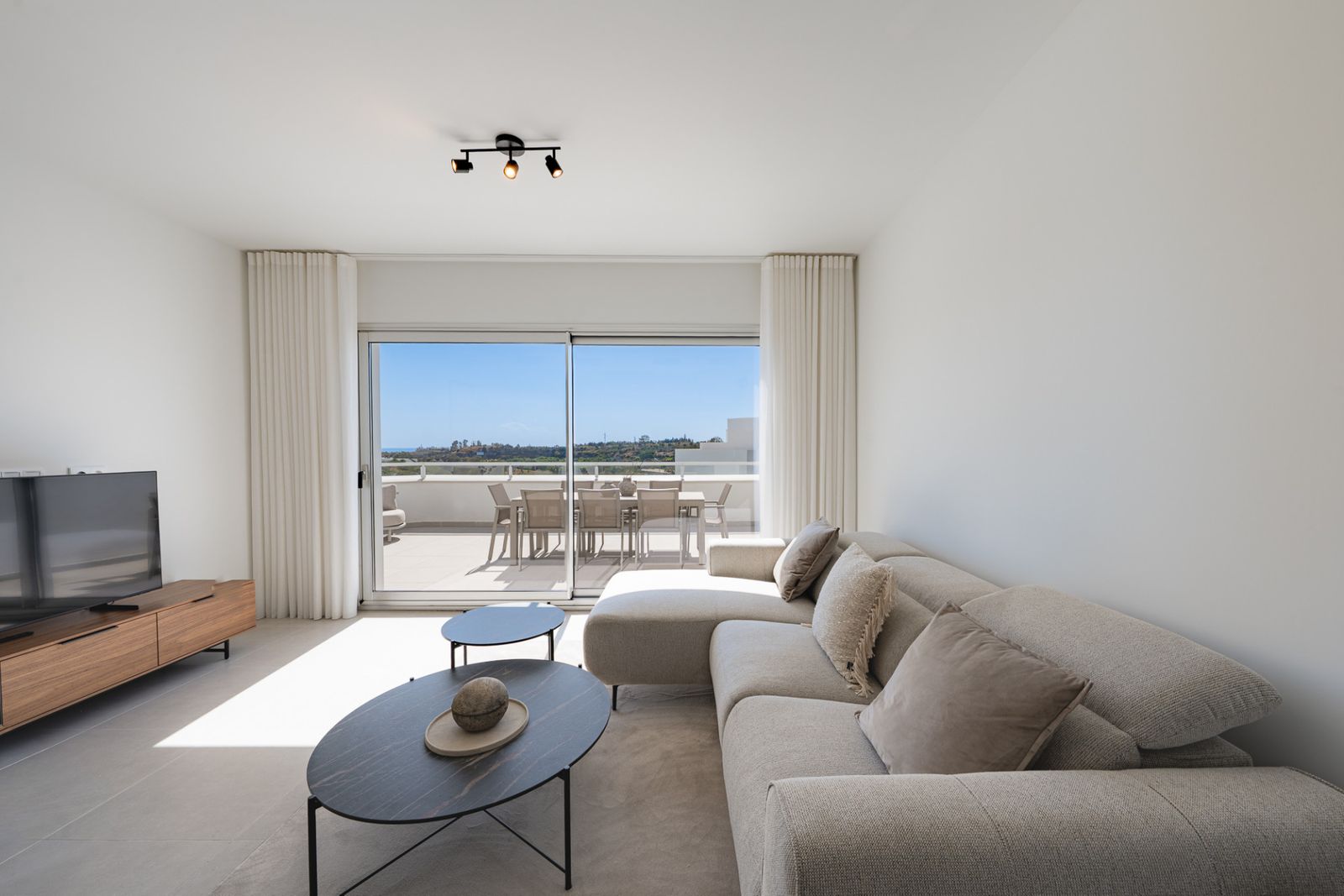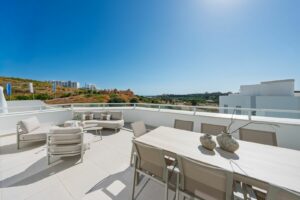 Discover this stunning second-floor duplex penthouse, offering breathtaking panoramic views of the sea and mountains. The home features a spacious living room terrace and a rooftop terrace with a private solarium and elegant white pergola, perfect for enjoying the Mediterranean sun in complete privacy.