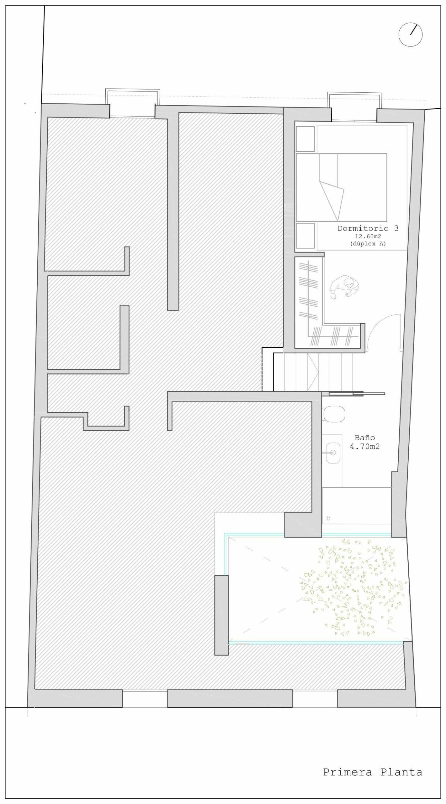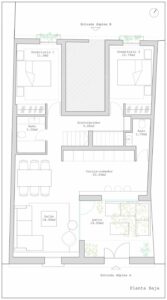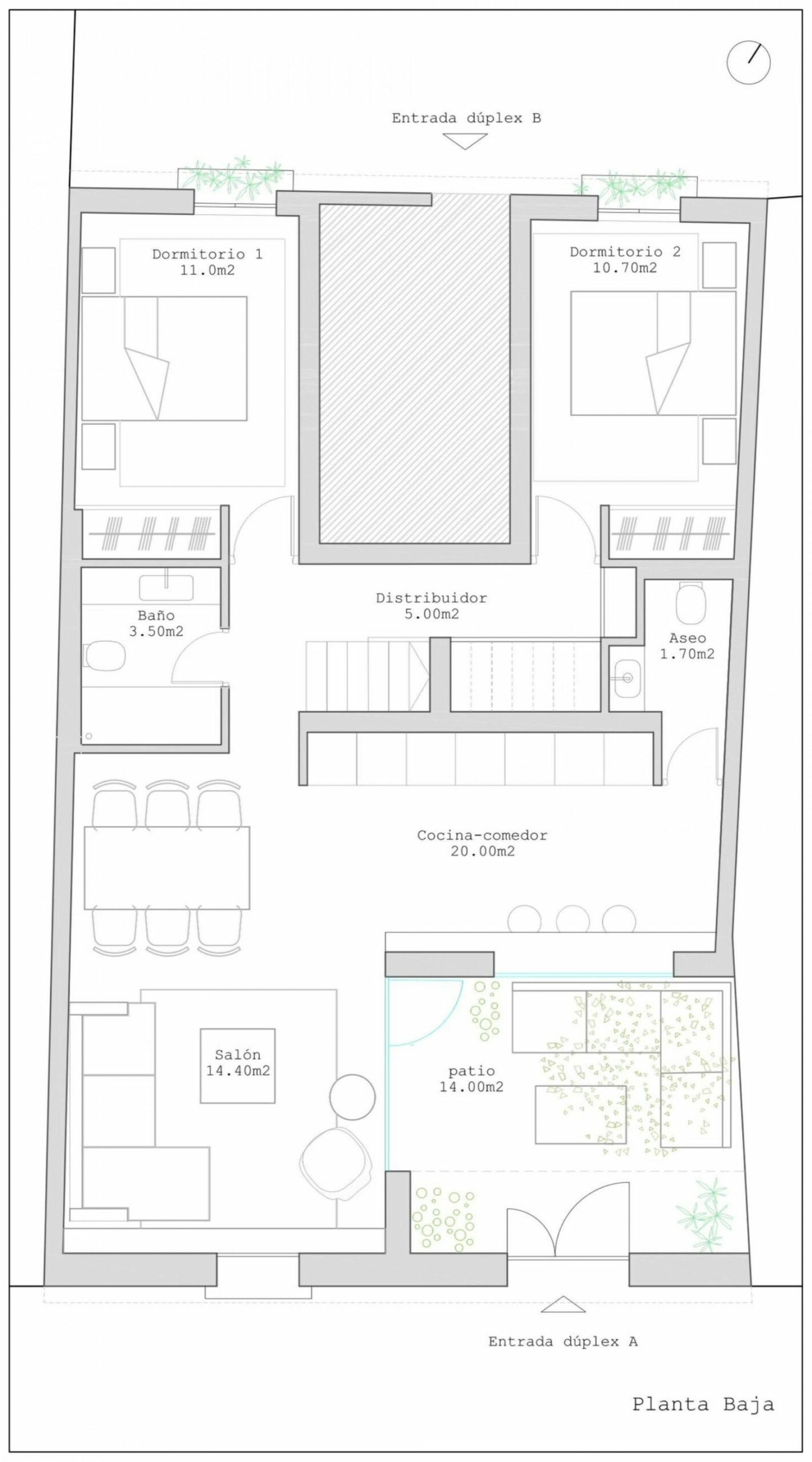 The ground floor features a spacious open-plan living, dining, and kitchen area, which opens onto a charming 14 m² interior patio that provides abundant natural light and ventilation. This level also includes two bedrooms, a full bathroom, and a guest toilet.