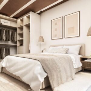 The project blends a contemporary interpretation of Andalusian architecture with a modern, refined design. The palette of neutral tones, warm whites, and natural wood creates an elegant and timeless aesthetic.