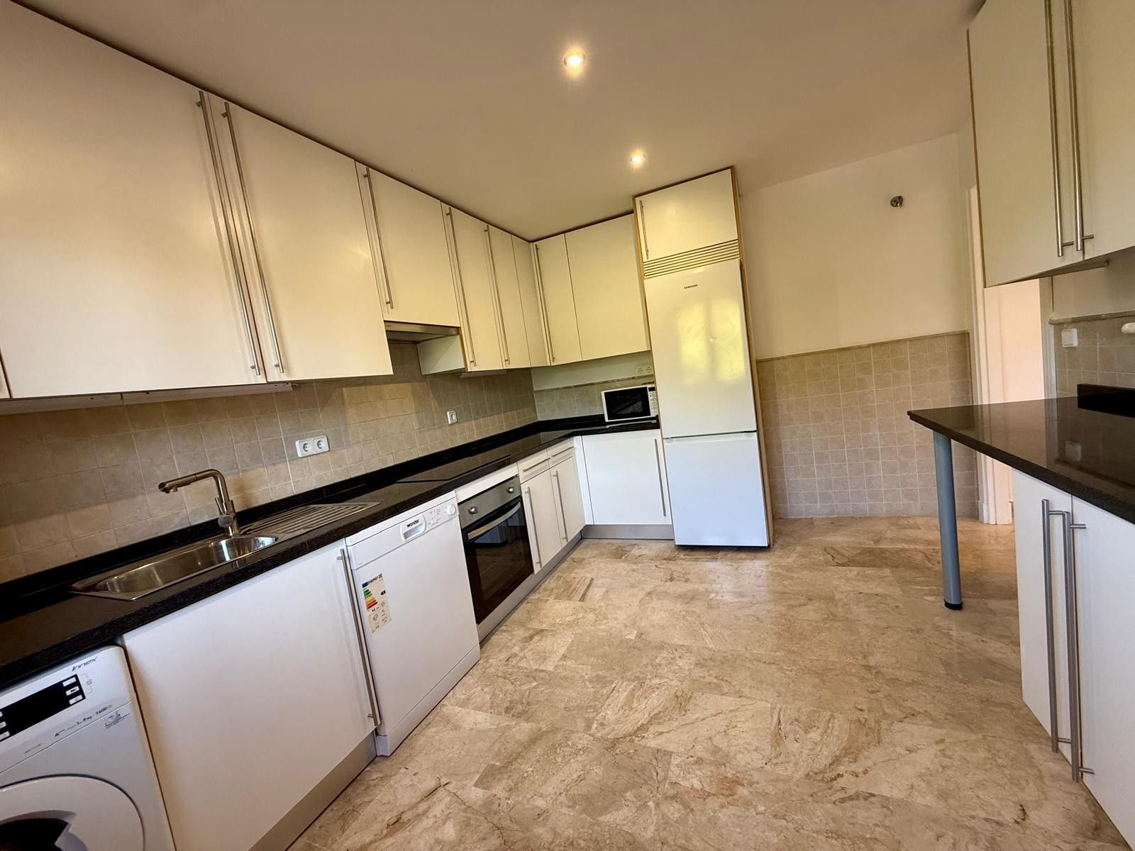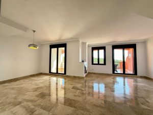The penthouse features three bedrooms, a separate office, two bathrooms, and a guest WC, arranged over two levels to create a practical and comfortable layout. The bright living area opens onto a terrace with open sea views, while the upper level leads to a private solarium designed for making the most of the sunshine and surroundings.