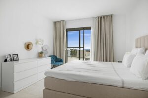 The penthouse offers three spacious bedrooms, two stylish bathrooms, an open-plan living area filled with natural light, and a large terrace overlooking the golf course and the sea.