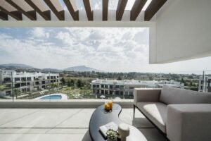 This luxury brand new penthouse in Atalaya Emotion, Estepona, features 3 spacious bedrooms and boasts a private terrace and solarium, offering breathtaking views of the surrounding landscape.