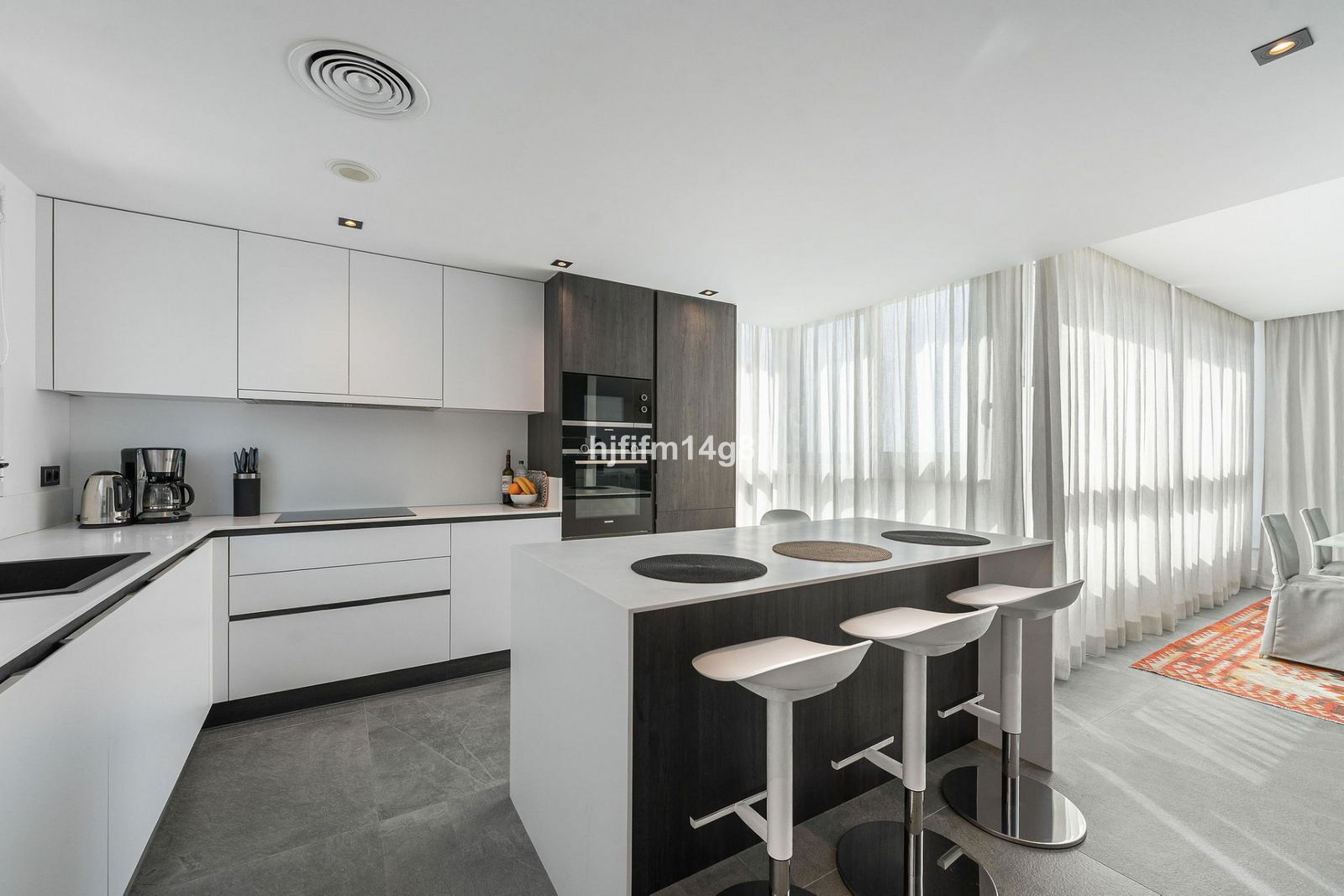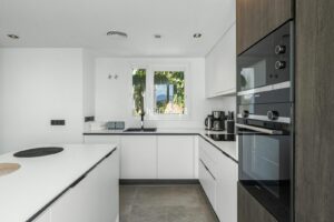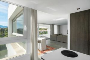 Straight ahead, the hall opens into a bright and airy living room with an open-plan kitchen—a space bathed in natural light thanks to windows in multiple directions. The west-facing terrace flows seamlessly from the living room, offering magnificent panoramic views of the sea, golf course, and surrounding mountains, ideal for enjoying sunsets and outdoor dining.