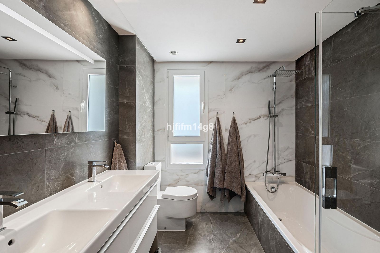 From the hall, a staircase leads up to the impressive master suite. The master bedroom features generous fitted wardrobes, a stylish en-suite bathroom with window, bathtub and a walk-in shower.