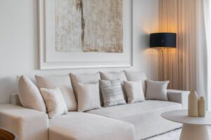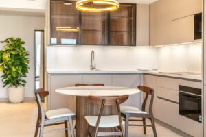Inside, the residence has been completely reimagined with a bespoke interior design and full furniture installation, marrying contemporary sophistication with a sense of warmth. Commissioned artwork and handmade curtains lend individuality and refinement, while new fitted carpentry provides discreet, seamless storage. The main reception space is anchored by a feature-lit television wall with integrated surround sound, a striking focal point that perfectly balances modern design with everyday comfort.