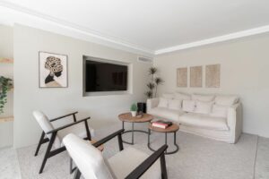 The highlight is the private rooftop terrace, complete with a sleek pool, dining and lounge area and panoramic views of La Concha and the city. It’s the perfect setting for slow mornings, sunset dinners and evenings with friends under the Marbella sky.