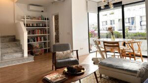The upper floor features two bedrooms with en-suite bathrooms, finished with top-quality materials. The master bedroom includes a cozy reading or relaxation area with partial sea views.