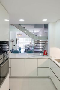 The entrance opens into a bright and inviting open-plan living and dining area, enhanced by a charming fireplace and seamlessly extending onto two expansive terraces. One terrace is thoughtfully designed with a BBQ area, perfect for al fresco dining and entertaining. The fully integrated kitchen complements the contemporary design and functionality of the living space.