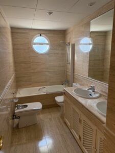 The apartment consists of 3 bedrooms and 2 bathrooms, one on suite and a good sized kitchen, although I am sure the new owners will break the wall down between the living areas