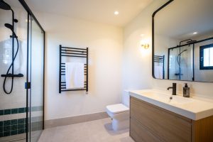 The upper level features two generous bedrooms, each with access to its own private terrace. On the lower level, an additional room serves perfectly as a home cinema, guest bedroom, or multifunctional space. The property includes two stylish bathrooms and a separate guest toilet.