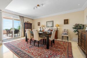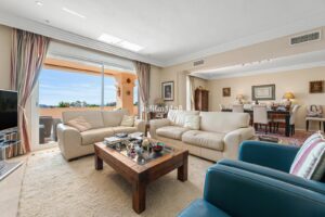 This impeccably presented three-bedroom duplex penthouse for sale in Albatross Hill, Nueva Andalucia, offers a perfect blend of luxury, comfort, and breathtaking Mediterranean views. Situated within the prestigious gated community of Albatross Hill in the heart of the Nueva Andalucia Golf Valley, this property enjoys 24-hour security and a wealth of resort-style amenities, including beautifully landscaped gardens, three outdoor swimming pools, an indoor heated pool, a gym, sauna, and a tennis court. The location is ideal for golf enthusiasts, with world-class courses such as Los Naranjos and Las Brisas nearby, while the vibrant marina of Puerto Banus and the area’s stunning beaches are just a short drive away.