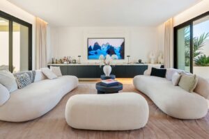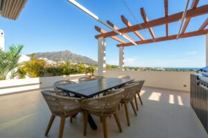 This exceptional duplex penthouse, offered exclusively through sole agency, is located within one of the most prestigious residential developments in Nueva Andalucía, Marbella. Recently refurbished to an impeccable standard, the property showcases a refined blend of contemporary design and warm Scandinavian aesthetics, resulting in an elegant yet welcoming living environment. With a built area of 183 m² and expansive terraces totaling 181 m², the home offers an outstanding balance between indoor comfort and outdoor enjoyment.