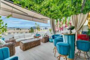 A standout feature is the top terrace, transformed into a sophisticated bar and chill-out space for entertaining. Residents can enjoy access to two outdoor pools, an indoor pool, and the added security of a gated community. The property also includes underground parking for extra convenience.
