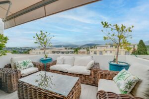 This renovated 3-bedroom duplex apartment in the prestigious Aloha Gardens, Nueva Andalucía, offers stylish and comfortable living. The open-plan kitchen flows seamlessly into the dining and living areas, with the living room opening to a second terrace ideal for outdoor dining or relaxing.