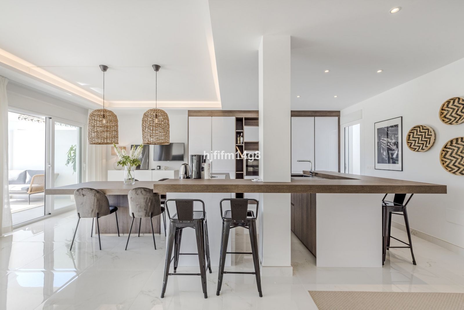 The penthouse itself has been totally refurbished to a high standard and enjoys beautiful mountain views, golf views and partial sea views. The interior is designed with modern living in mind, featuring an open-plan fully equipped kitchen with a breakfast bar that flows seamlessly into the combined dining and living area. This bright and spacious living space opens directly onto a generous terrace, offering plenty of room for outdoor dining and relaxing while enjoying the surrounding views.