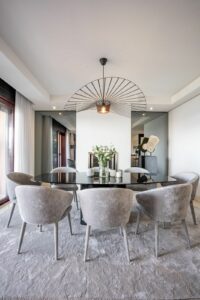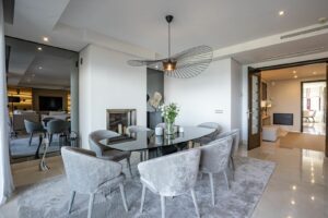 Inside, the residence showcases premium materials and a sophisticated Scandinavian-inspired design. The welcoming entrance hall leads into an expansive open-plan living and dining area, tastefully appointed with comfortable seating and a modern electric fireplace. This elegant space opens onto a generous terrace with stunning sea views—ideal for relaxing or entertaining in style. The sleek designer kitchen is equipped with high-end appliances and includes a separate utility room for added convenience. The main level also features a bright en-suite guest bedroom with its own private balcony enjoying beautiful mountain views.