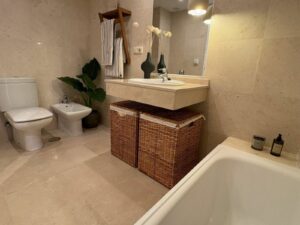 The penthouse is ready to move into and features amenities such as air conditioning (heating and cooling), underfloor heating in the bathrooms, and a sound system throughout. The property is located on the second floor, with direct elevator access to the underground parking.
