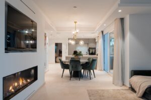 The home’s interior is defined by light, flow, and precision. The layout has been carefully arranged to provide a sense of openness while maintaining privacy between the living areas and bedrooms. At the core of the property lies a Poggenpohl open-plan kitchen fitted with NEFF appliances, creating a space where design meets practicality. The kitchen extends into a spacious living and dining area that opens directly to the south-facing terrace, a perfect setting for outdoor dining and entertaining, complete with a built-in BBQ station. The west-facing terrace, accessible from both the master bedroom and the living room, offers an inviting lounge space where residents can enjoy the tranquil Mediterranean evenings and spectacular sunset views.