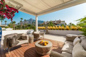 Luxurious three-bedroom duplex Penthouse with en-suite bathrooms for sale in Las Lomas del Rey, a secure and prestigious urbanisation ideally located on Marbella’s exclusive Golden Mile. Built in 2006 and recently renovated, this elegant property combines contemporary finishes with practical luxury, offering 276 sqm of total built space, including approximately 114 sqm of private terraces. With its elevated position, the apartment enjoys uninterrupted views of the surrounding La Concha mountain and landscaped communal gardens, making it ideal for those seeking comfort, views, and a lifestyle grounded in convenience.