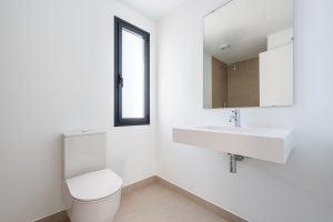 The home features three generously sized bedrooms on the upper level, along with two full bathrooms designed for both functionality and style. The ground floor welcomes you with a bright and airy living area, a guest toilet, and seamless access to the outdoor spaces. Large windows enhance the sense of space and connect the interior with the exterior, allowing natural light to flow throughout the home. From the living area, you step directly onto the terrace and into your own private garden — an ideal space for outdoor dining, children’s play, or simply enjoying the Mediterranean climate in complete privacy.