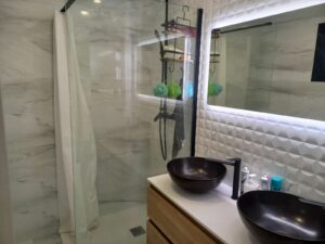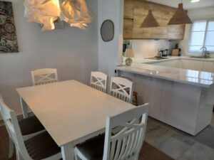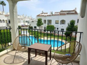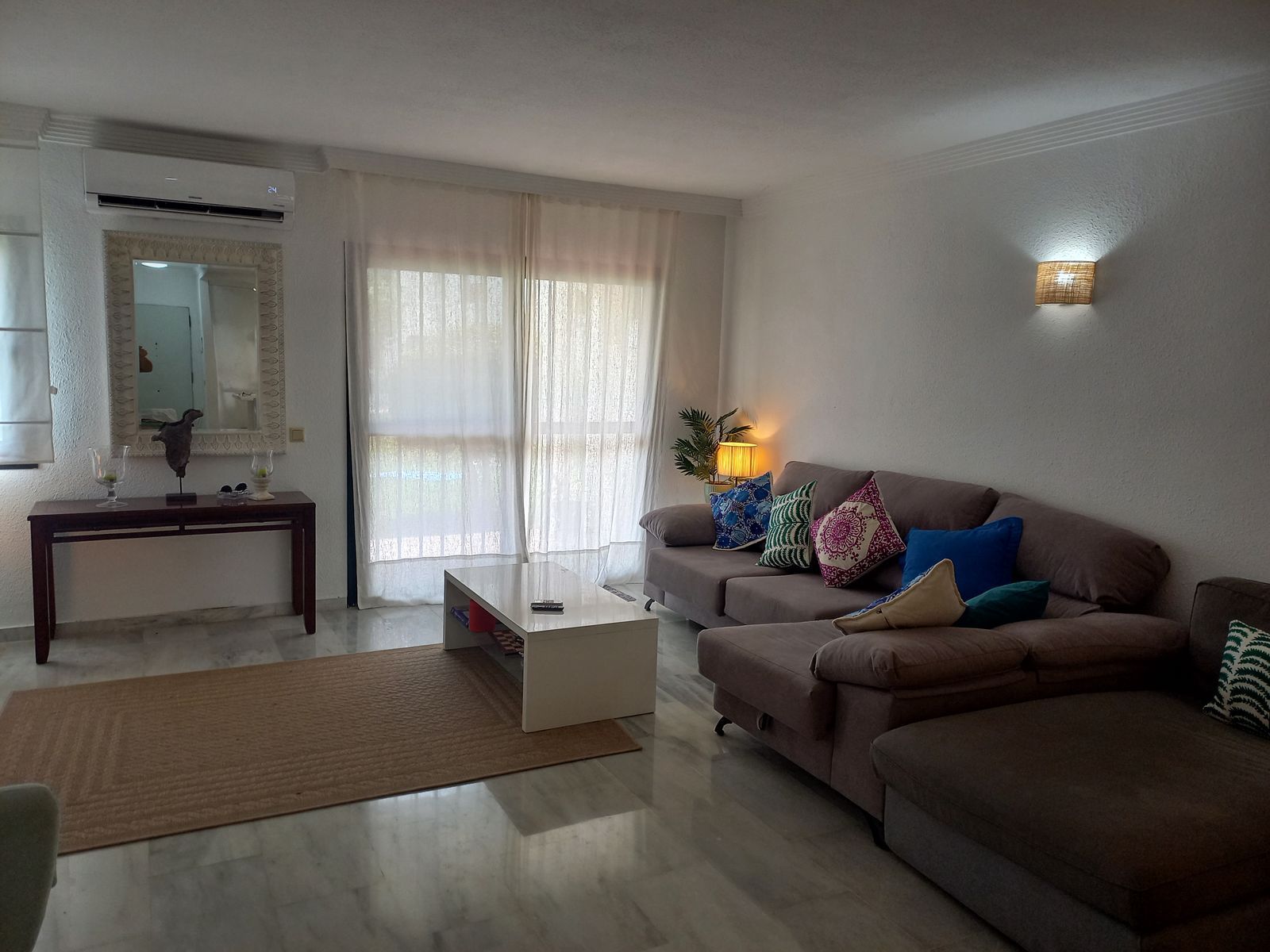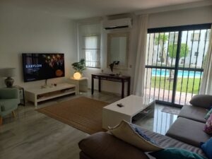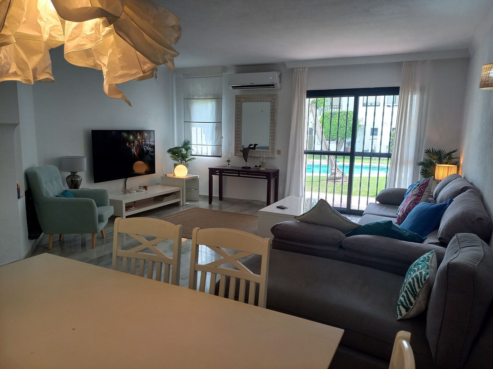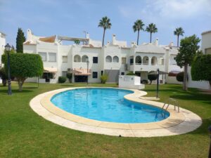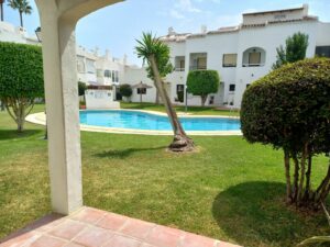 Spacious townhouse set within a private well maintained gated community in Bel Air. Recently renovated property featuring an open plan kitchen, good size lounge with a fireplace, w.c., 3 bedrooms and 2 modern bathrooms. There is a south facing terrace downstairs, a terrace upstairs and a generous size roof solarium. The house enjoys direct access to a large swimming pool, mature green gardens and a serene atmosphere. The area boasts various hotels, a variety of supermarkets, restaurants, bars and a chemist. The beach is within walking distance or less than a 5 minute drive away with easy access to the motorways connecting Estepona, Marbella and Malaga. Private parking space directly at the entrance of the property.