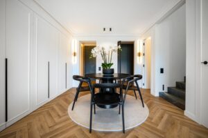 The townhouse features a warm and modern open-plan living and dining area with wooden accents. A large terrace flows from the living room, and all bedrooms have private terraces. The fully fitted kitchen is designed for both style and practicality. Interiors are bright and contemporary, blending comfort with a timeless design.