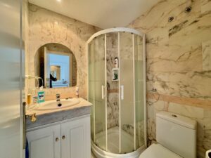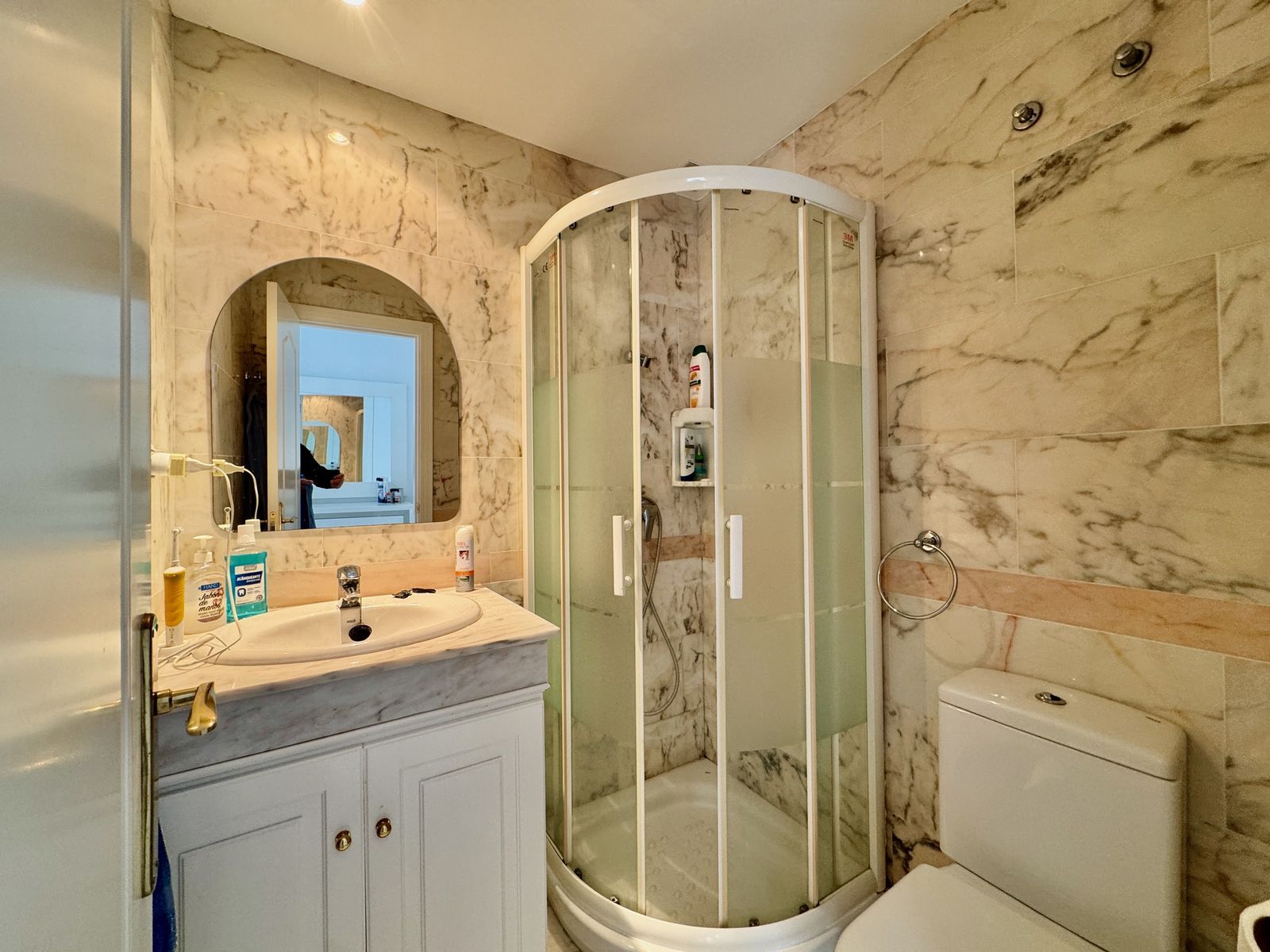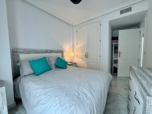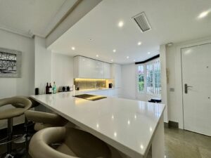 This attractive three bedroom house is located in a frontline golf position while still being walking distance to the beach. The house has three real bedrooms on the upper level and two bathrooms plus a guest toilet. Many owner have even added an extra bedroom and bathroom in the basement/garage while this owner has choosen to keep the garage and storage space. The owner has improved the property with an amazing modern kitchen false ceilings with spot lights giving the property a modern feel. With two nice terraces on the lower level and also a roof terrace one has plenty of outdoor space to really allow one to enjoy the Spanish climate. The complex is gated with two swimming pools.