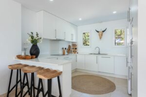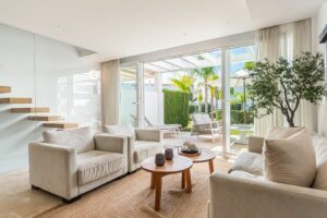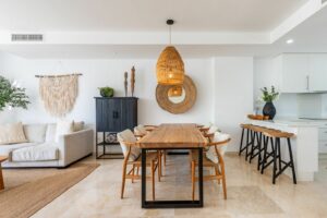 Modern townhouse with Bali-inspired interior, designed with earthy tones and natural materials to evoke a warm, tropical ambiance.