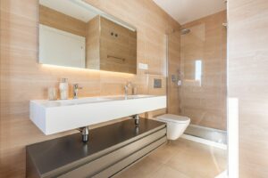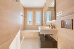 A floating staircase leads to the three-bedroom level with two bathrooms, both with underfloor heating. From here, you can access a stunning solarium with a pergola and with sea views, perfect for relaxing or entertaining.