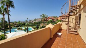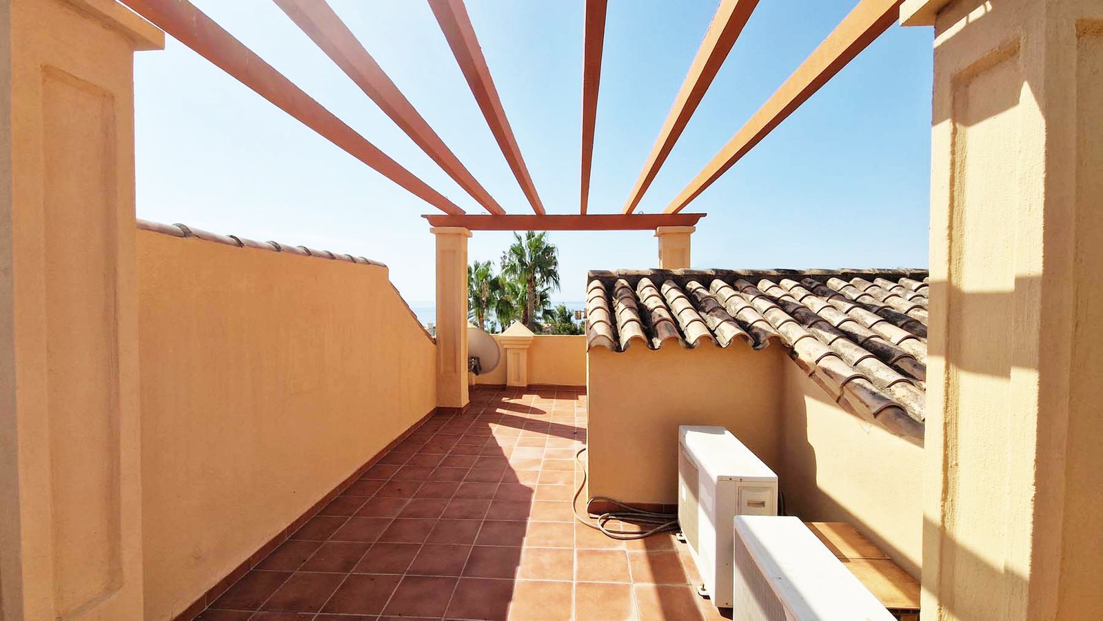 VERY NICE SEMI-DETACHED HOUSE WITH SEA VIEWS FOR SALE IN ESTEPONA!! This corner townhouse is located in the sought-after, secure, private development of Galera Park. Located 200 meters from the seafront, its location within the development protects it from the noise of the coastal road. The house is built on four floors. All floors have an elevator. The first level is the private underground garage, where two vehicles can easily be parked. The owner replaced the garage door with a much better-quality automatic one when he bought the property. The second floor consists of a beautiful living/dining room, a fully equipped semi-open kitchen, and a guest toilet. The living room leads out onto a charming terrace with a bit of sea view and a large, pleasant private green area overlooking the pool and the sea. On the first floor, there are three bedrooms and two bathrooms. The master bedroom has an en-suite bathroom and leads out onto a terrace that provides access to the fourth floor, the solarium, from where you can observe the surroundings and enjoy splendid sea views. You can see the sea from the living room terrace and also from the master bedroom terrace. The house has always been very well maintained by its owners, who even soundproofed the side wall of their only neighbor. Many shops are nearby, including two large supermarkets! This property is being sold partially furnished. All appliances remain. Ideal property for a family, either as a primary residence or for vacations.