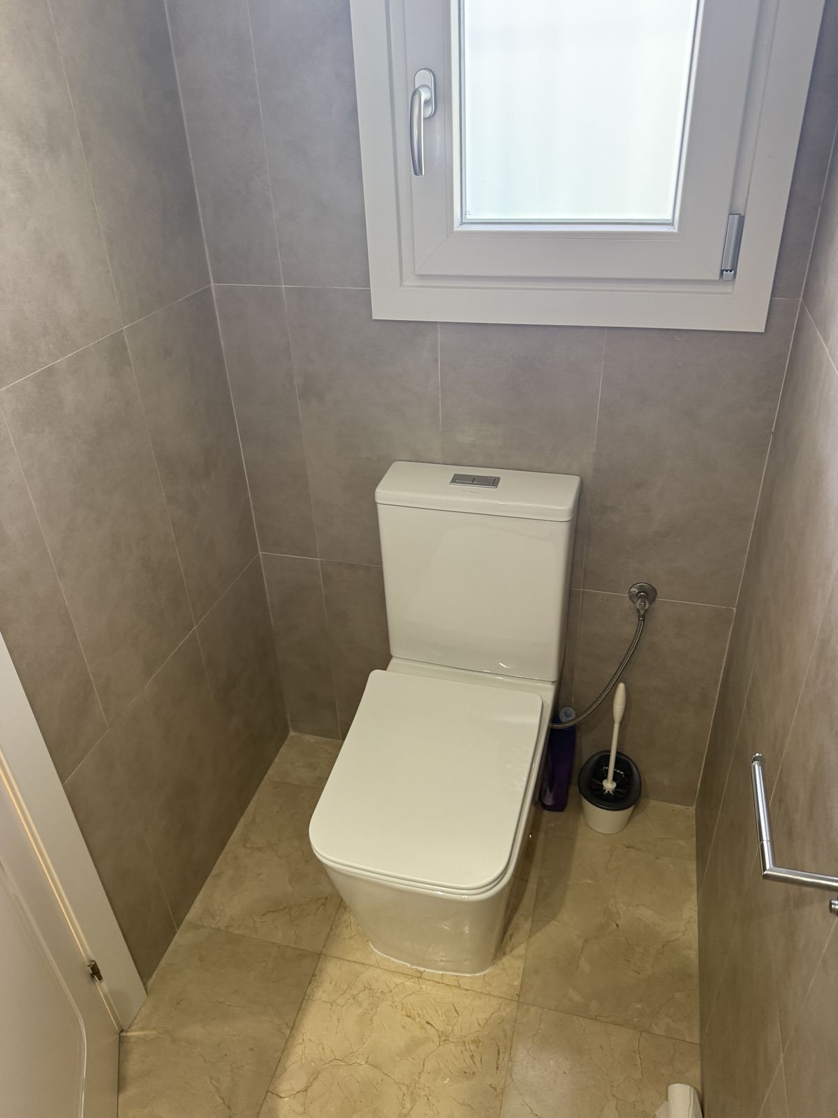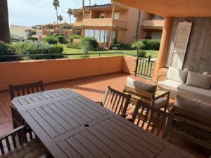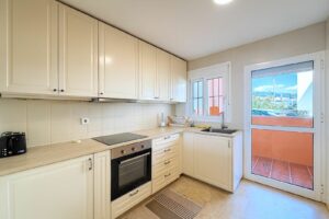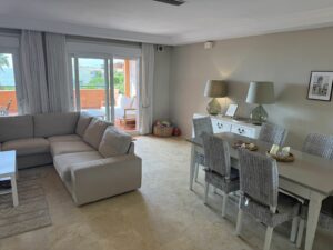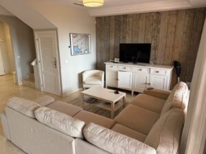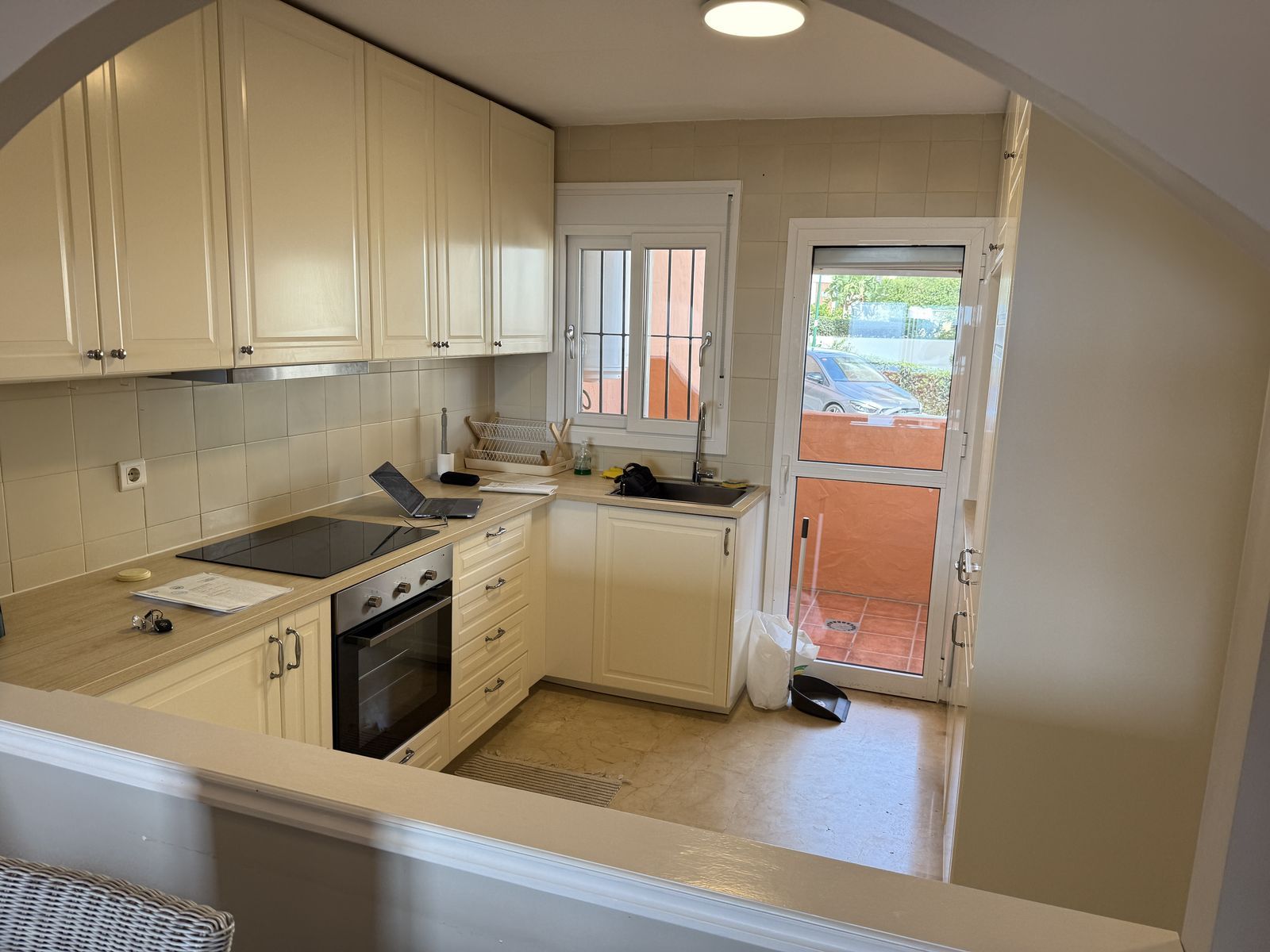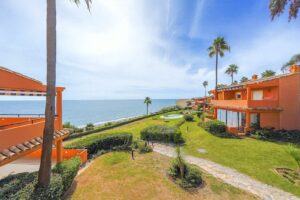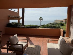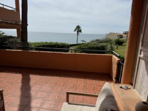 This is a fantastic property situated in Bermuda Beach, in an enviable front line beach position offering panoramic sea views. The property is currently being renovated to a very high standard including a new Italian kitchen, bathrooms in a modern contemporary style, new cream ceramic flooring throughout and new windows with electric blinds. The resulting effect is stunning and makes a perfect luxurious family home. The views can be appreciated from the moment you enter the property giving the "wow" factor. The kitchen and living room areas has been made into an Open-plan format making it much more spacious. There is ample space on the terrace which leads off from the living room – enough for sun-beds as well as a large dining table and chairs. Upstairs are the bedrooms with the Master bedroom having an ensuite bathroom and its own spacious balcony with those incredible sea views and two further guest bedrooms sharing a bathroom. There is a private space for the car and there is a supermarket and restaurants within easy walking distance and it is only 10 minutes by car to arrive at the town of Estepona. A great value for money property in an unbeatable location.