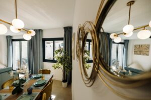 The town house boasts three generously sized bedrooms and three well-appointed bathrooms, ensuring ample space for family living or hosting guests. The interiors are meticulously designed, featuring a living room along with a dining area that flows effortlessly into an open plan, fully fitted kitchen, complete with state-of-the-art appliances. The presence of gres floors, double glazing, and glass doors further accentuates the elegance of this residence, along with practical features such as electric blinds, fibre optic internet, and air conditioning across all areas, promising a comfortable and connected lifestyle.