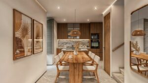 Spanning 173m² with an 11m² master terrace, the townhouse is perfect for enjoying the authentic Mediterranean village lifestyle. The ground floor boasts a spacious, open-plan living room that seamlessly merges with the kitchen. This kitchen is fully equipped with Siemens appliances, featuring walnut-finished cabinetry and a porcelain countertop, combining functionality with style.