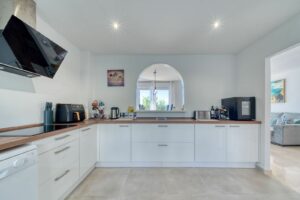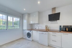 The ground floor features a brand new kitchen with premium appliances, sleek cabinetry, and stone surfaces that open naturally into a bright, spacious living area. Large new windows fill the interior with natural light and create a fresh, inviting atmosphere. Each of the three bedrooms is fitted with elegant built in wardrobes, while the redesigned bathrooms showcase contemporary fixtures, high end finishes, and tasteful lighting. The home is fully air conditioned for year round comfort. A standout feature is the photovoltaic solar installation that supports lower energy costs and reflects a thoughtful, sustainable approach to modern living. Outdoor areas are equally impressive with a private garden ideal for quiet mornings and relaxed evenings, along with a generous roof terrace that captures open views and coastal breezes. The large communal swimming pool offers a resort style experience within a peaceful residential setting.