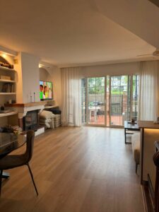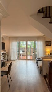 Main floor: Bright, very spacious living-dining room with fireplace, opening onto a magnificent terrace-porch and the communal garden with swimming pool, ideal for keeping an eye on the little ones. Kitchen and guest toilet on the same floor.