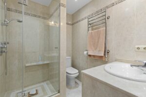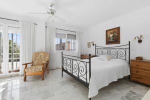 The property comprises three well-proportioned bedrooms. The master bedroom benefits from fitted wardrobes, an en-suite bathroom and direct access to the terrace. A second double bedroom also enjoys direct access to the terrace, while the third double bedroom is a nice size. A family bathroom is fitted with both a bathtub and a separate shower. Electric heating is provided via an electric heater and an electric wall heater in the hallway.